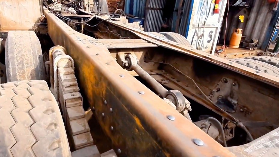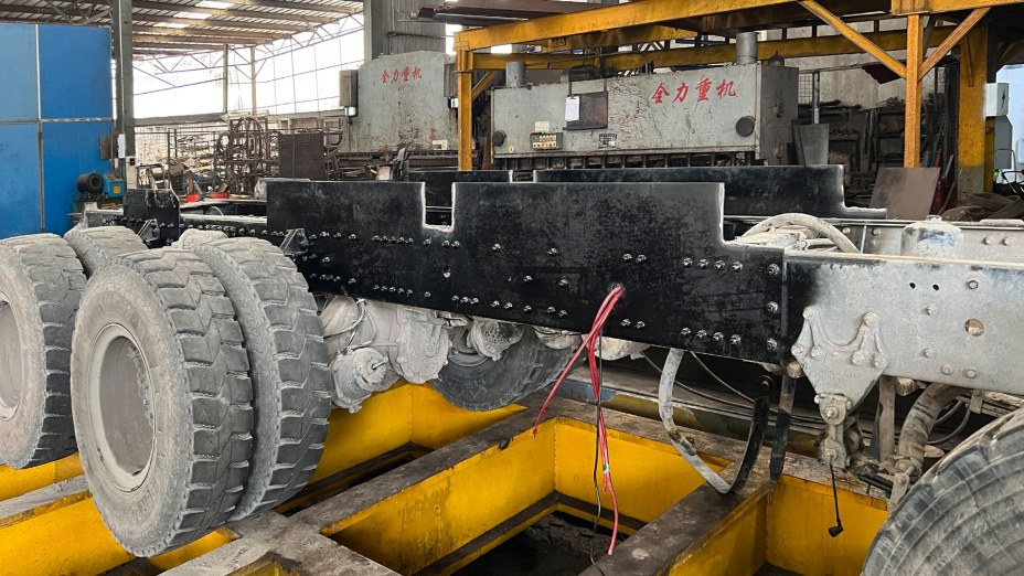 因为车架的纵梁和横梁基本是通过铆焊接的方式连接在一起,在九久汽车的修理车间,维修师傅会通过液压机矫正变形的大梁。由于原货车大梁往往存在断裂和金属疲劳等因素,在矫正完毕后工人师傅会在内外侧加装高强度钢板来加固大梁来提高安全性。
