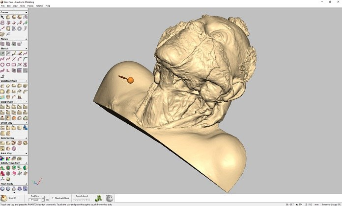 “Freeform是我们一直以来使用的一款软件,它能实现3D场景下的快速3D物体操控,还能通过触觉设备模拟触感。我们这里结合使用了Phamtom Omni触觉设备和Freeform。该软件基于体素黏土模型,您可快速使用一些操作器,比如布尔运算,或仅保留场景下大物体等操作。此外,您还能通过模拟真实黏土模型的触感,在3D物体上雕刻,比如增添细节、修饰形状……当然,也有其他3D软件可以实现这些功能,但速度远没有Freeform来得快。”