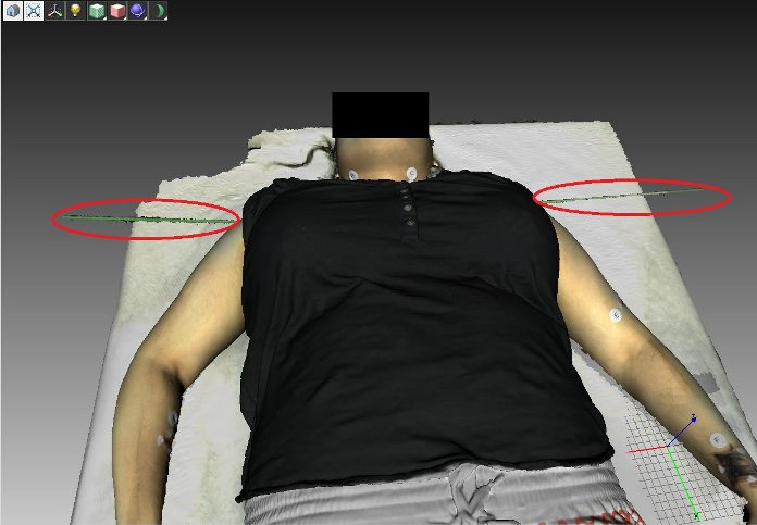该实验包括两项测试,均在同一条件下进行和观察:一项通过摄影术记录,另一项通过Artec Eva记录。第一项测试要求参与者平躺。为记录距离,测试中全程使用了卷尺来记录脸部和身体的方位信息(如鼻子、肘部和膝盖等)。随后,通过桌上标出的刻度比例为人体照相。同时,对身体上的伤口进行近距离拍摄。