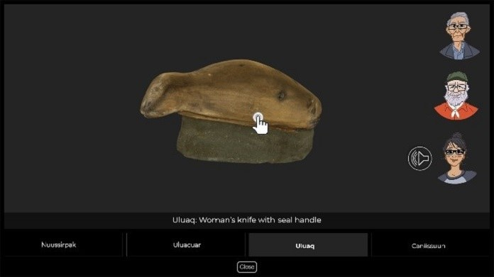 这些教育资源能让孩子们对根据考古发现和当地传统说制作的草屋模型进行深入探索。用户可以拖动界面,点击选中的物品,画面随即弹出考古地周围挖掘的文物3D模型,还能聆听一段村落长者、考古学家和工匠的解说,了解祖先生活中的不同角色。通过这种方式将Artec扫描与有意义的音频信息结合,是对尤皮克历史故事口口传颂这一传统的尊重。
