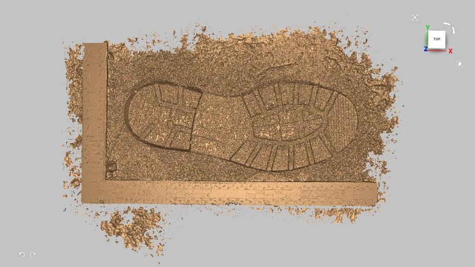 效果:不到一分钟,Artec Space Spider就在犯罪现场完成了立体鞋印的记录,精度水平高。和鞋印铸模法不同,这些3D“数字铸模”牢不可破,便于运输与储存,多年后依然可以使用。