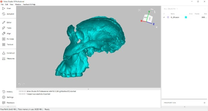 在Artec Studio中,Martin使用橡皮擦移除了背景,随后对齐扫描。之后,又进行了整体配准,再删除离群噪点,进行尖锐配准。对这些操作,他解释道:“如果是处理人类头骨,我希望能看清所有质量性状,所以精确度设为100微米。这样就能看到我想要的特征了,比如颞线、颅缝、小孔等。”