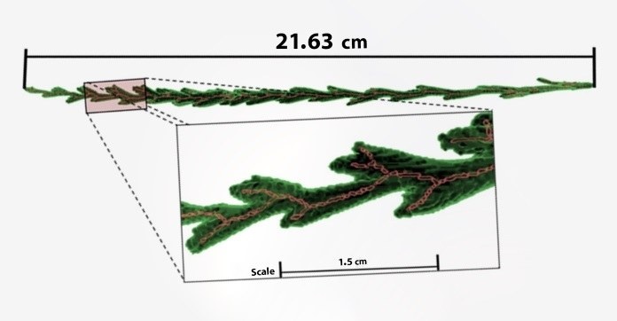 然后,他把每块切片的正中心连接起来,形成一根完整的麦穗。用Tubbs的话说,“这样就能把研究聚焦到正中心,关注麦穗结构以及其他复杂特征,供像我这样的研究人员分析穗长、小穗结构、每棵麦穗的小穗数量、小穗在叶轴上的间距、小穗与叶轴的角度、小穗大小等方方面面。”