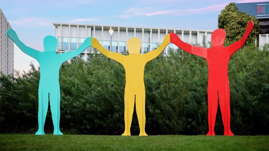 三个色彩缤纷的人物剪影是由当地回收的钢板和低碳无混凝土底座制成。图片来源:Edinburgh Photographic