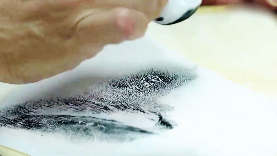 拓片的制作需要把不同纸料覆盖在甲骨文表面,使用毛刷等工具对之进行轻轻捶打,揭去干燥纸料。等待湿润纸料稍干后用扑子蘸取适量染料,轻轻拍打湿润纸料进行复刻。等待完全晒干或风干后取下,才完成整道工序。
