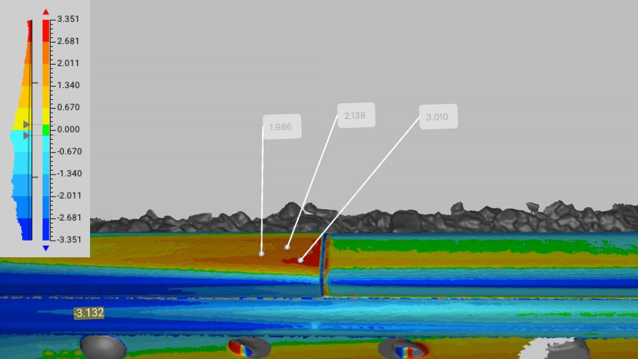 Artec Studio的表面距离映射比较了同一铁轨相隔数月(寒冷的冬天清晨与炎热的夏天)的两次扫描结果。