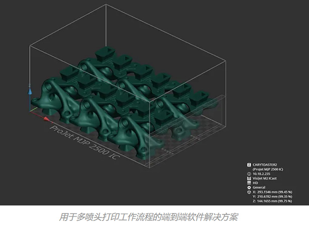 利用无需工具的 RealWax™ 多喷头打印,可使蜡质模型生产时间缩短数周,缩短上市时间。ProJet® MJP 2500 IC 通过直接蜡质模型打印实现数字化工作流程,提高了生产率,缩短了上市时间,为客户带来优质的交付服务。凭借快速的蜡质模型生产、短周期和 24/7 的不间断运转,ProJet MJP 2500 IC 的输出和改进的铸件空间效率可成为您坚实的依靠。