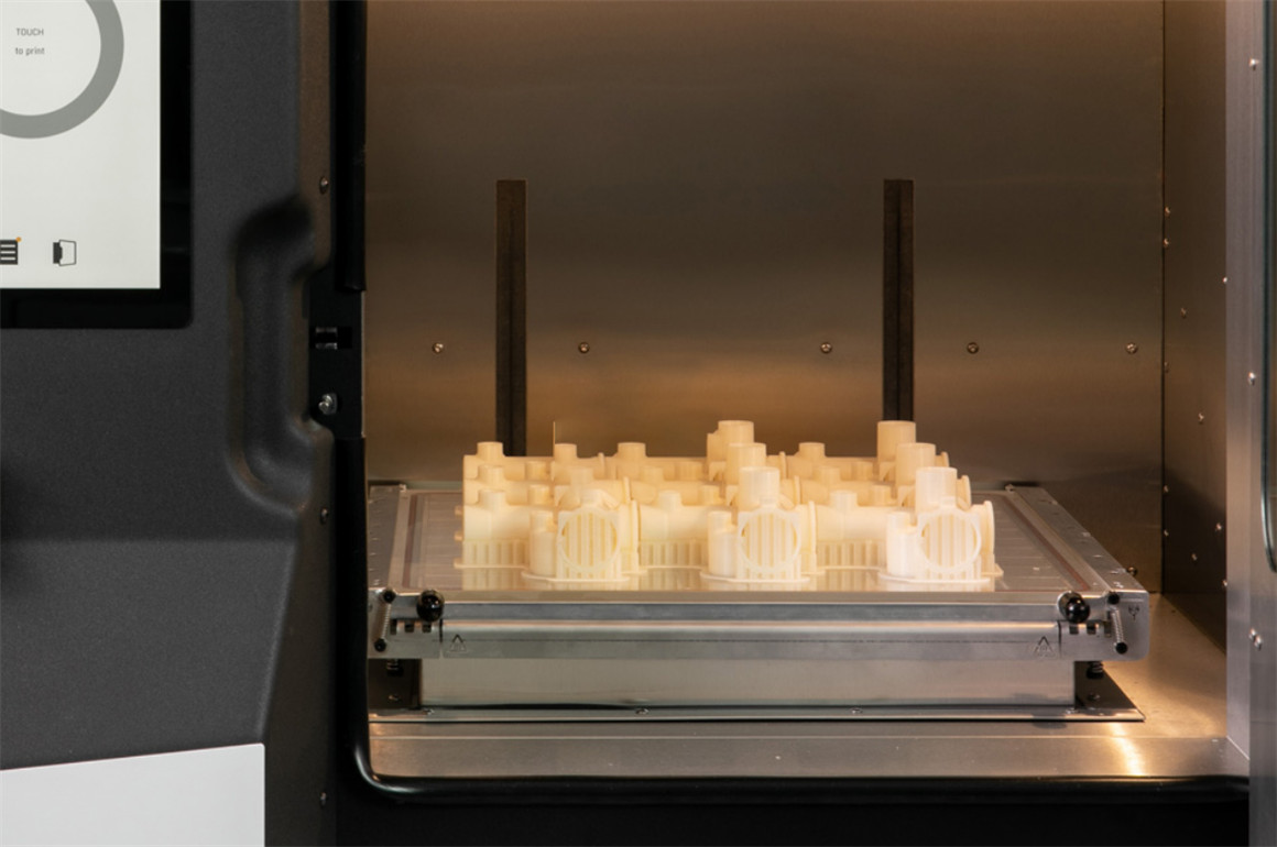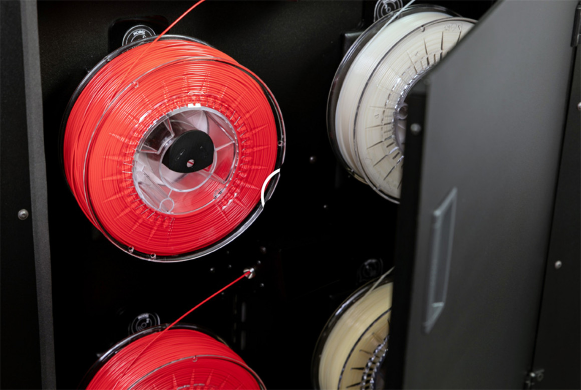 材料保持始终干燥并准备打印。由于加热的材料室,材料保持在稳定的环境中。材料室中有 4 个材料舱:两个专用于模型材料,两个用于支撑。当材料用完时,它将在挤出机中自动替换为来自第二个托架的材料。