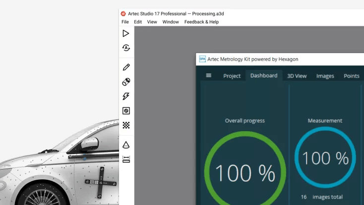 计量级摄影测量法是另一款测量工具,可以将各个角度拍摄的照片合成为3D点云。计量级摄影测量套件应配备标记点(粘性贴或磁贴)、比例尺、参考十字和一台性能强大的相机。三维扫描仪配合这样一款套件,就摇身变成了制作高精度3D模型的优秀解决方案。摄影测量法制作的3D点云可以和三维扫描生成的3D网格对齐,结合两种技术强项,成就更高精度。