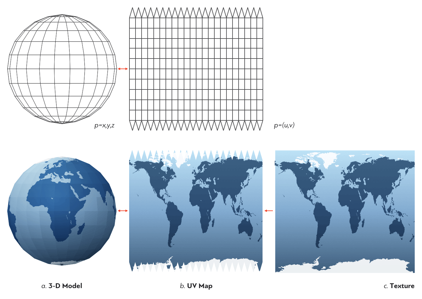 在计算机绘图和3D扫描领域,纹理指曲面表面的图案。纹理图案存储于特殊文件中,每个像素带有U和V坐标值,且有对应的颜色。为曲面添加纹理的过程被称为纹理映射或UV映射。