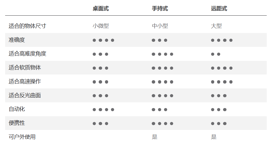 看完这些排名后,我们发现它们有个相同的思路:大多数对比的都是几款差异较大的扫描仪,且挑选标准非常不明确。重要的是,这些排名没有考虑扫描对象和扫描目的。所以,如果没有明确参数对比,怎么能知道该选哪款呢?比如说,要扫描一辆车、一架飞机或一只脚——哪款表现好呢?